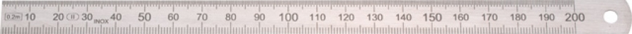 Merilna skala je razločna, elektrolitsko jedkane črne razdelitvene črte in številke z gladko površino, robovi ravnila so zaobljeni. Meritev poteka od leve proti desni.