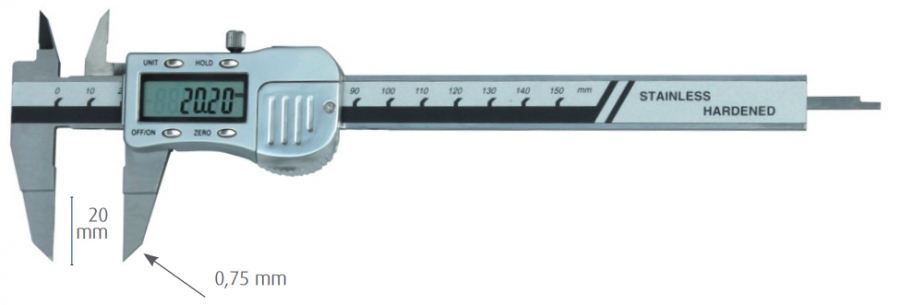 Digitalno pomično merilo z zelo tankim merilnim kljunom.