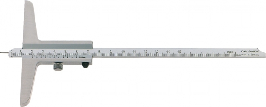 Izvedba: Zamenljiva merilna konica, ena stran z zamenljivim merilnim zatičem, druga stran z zaobljeno merilno palico, nonius mat kromiran, zaklepni vijak