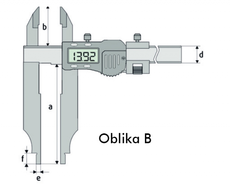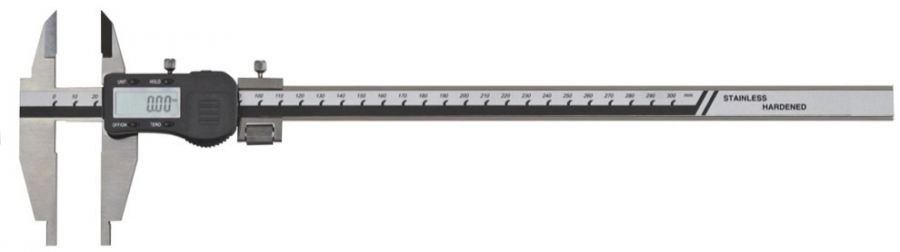 Digitalno pomično merilo s konicami in fino nastavitvijo z možnostjo shranjevanja merilne vrednosti za poznejše odčitavanje. Za zunanje, notranje in stopničaste meritve z nastavkom za velikost lukenj za notranje merjenje.