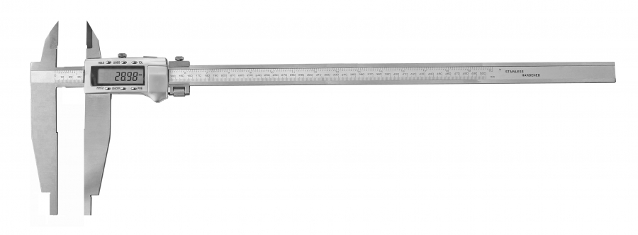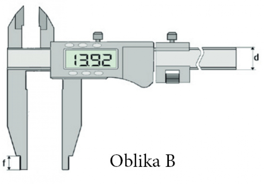 Digitalno pomično merilo s konicami in s fino nastavitvijo. Možnost preklopa med absolutnimi in relativnimi meritvami, s prednastavitvijo izmerjene vrednosti.