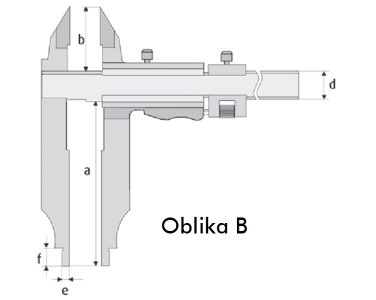 Precizno pomično merilo s konicami in fino nastavitvijo za notranje, zunanje in stopničaste meritve, z nastavkom za velikost lukenj za notranje meritve.