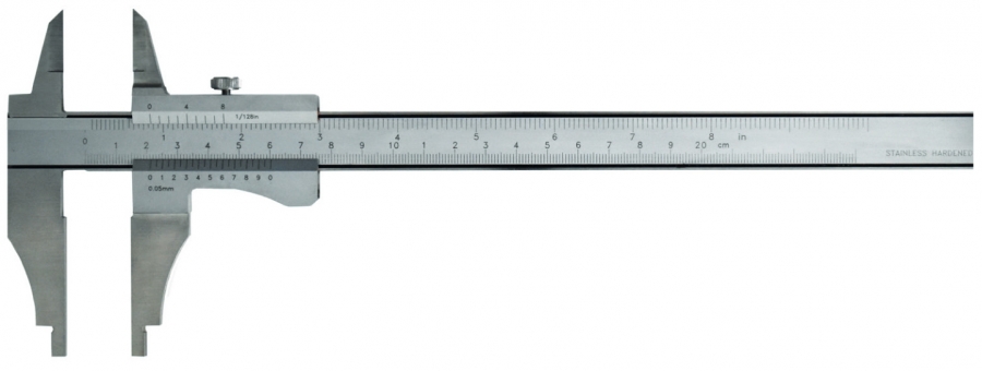 Precizno pomično merilo s konicami in brez fine nastavitve, za zunanje, notranje in stopničaste meritve in z nastavkom za velikost lukenj za notranje merjenje. Iz nerjaveče, utrjene zasnove.
