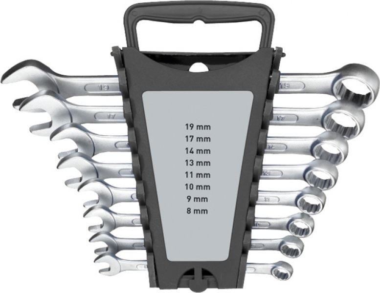 Set osmih viličasto obročnih ključev s 15° nagibom čeljusti. Ključi so kvalitetno kovani v utopu ter iz krom-vanadijevega jekla s fino matirano površino. Vsako orodje je zaradi svoje pregledne postavitve hitro dostopno.
