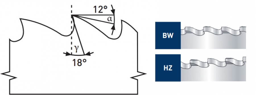 • BW = izmenično ukrivljen zob za rezanje materiala debeline do 4 mm