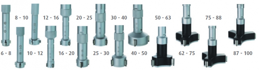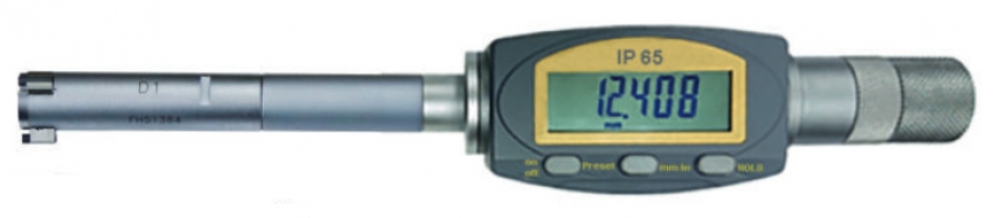 Tri točkovni digitalni notranji mikrometer z nastavitvenim obročem in podaljški z zaščito IP 65. Primeren za merjenje slepih lukenj.