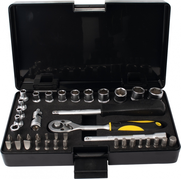 | 22x bit nastavkov 1/4": navadni 3 - 4 - 5 - 6 - 7 - 8 mm, Phillips PH1 - PH2, Pozidriv PZ1 - PZ2, šesterokotni 3 - 4 - 5 - 6 - 8 mm, Torx T10 - T15 - T20 - T25 - T27 - T30 - T40 |