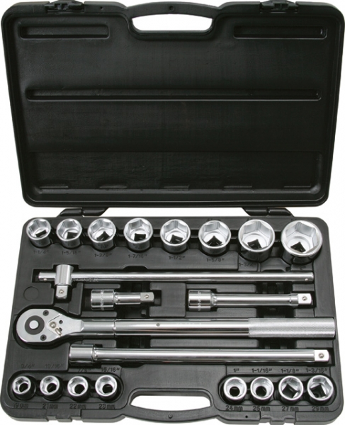 Kvalitetno 21 delno orodje 3/4" natičnih ključev, raglje ter dodatkov - iz krom-vanadijevega jekla v priročni škatli. Orodje je zaradi same postavitve hitro dostopno ob odprtju škatle.