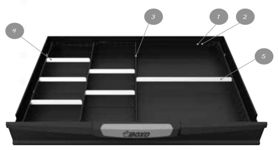 Model 5 (DD009A-15): Kvalitetni predalni delilnik iz aluminija za večje deljenje prostora. Primerno za deljenje večjih prekatov za večja orodja. Primer izvedbe postavitve (glej št. 5).
