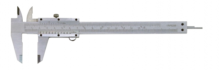 Pomično merilo iz orodnega jekla s kromirano skalo in nonijem. Mat kromirana površina proti bleščanju.