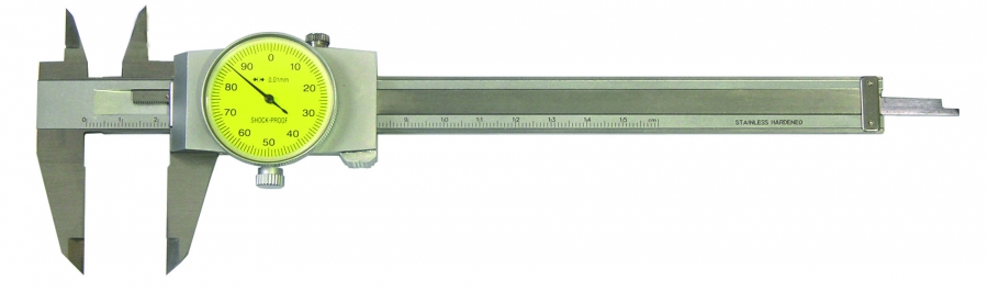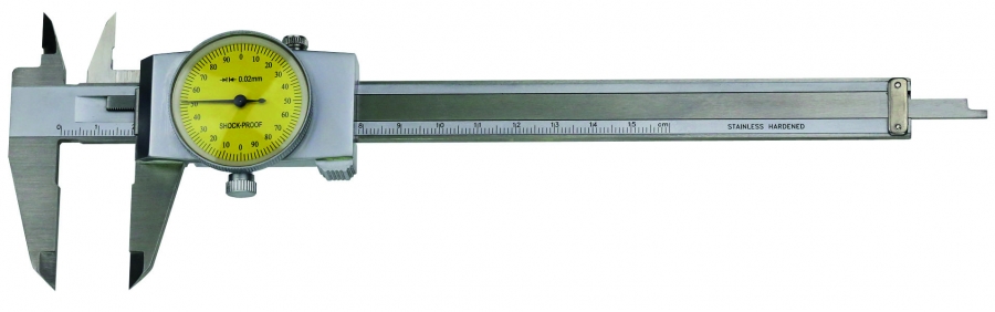 Pomično merilo z merilno uro z vrtljivim gumbom, narejeno iz nerjavnega kaljenega jekla.