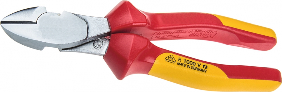 Stranske ščipalne klešče s polirano in kromirano glavo, natančnimi rezalnimi robovi in neposredno brizgani, težki ročaji.