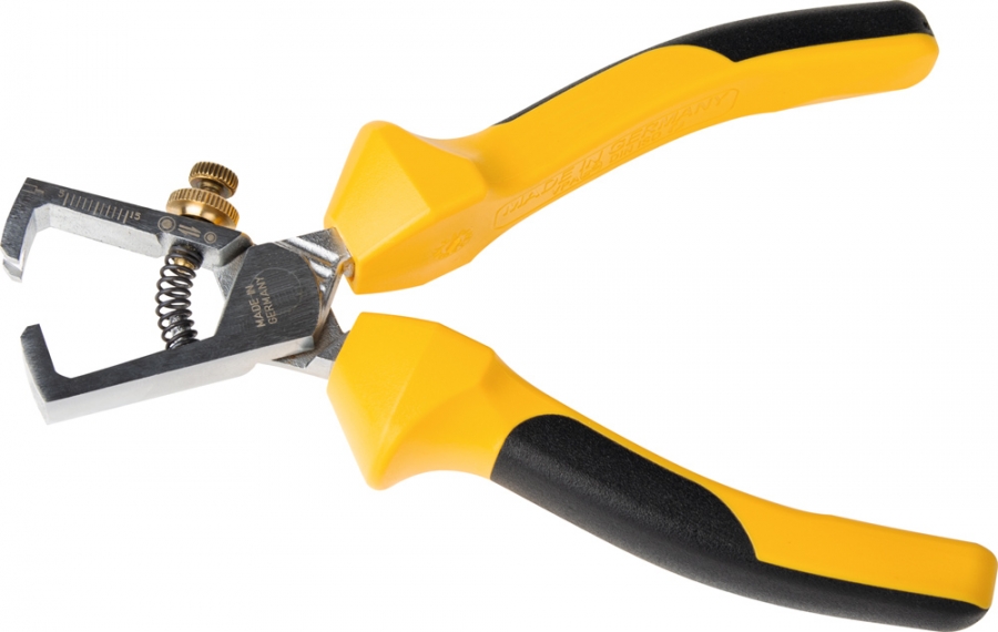 Klešče za odstranjevanje izolacije z žič, s polirano in kromirano glavo ter težkim dvokomponentnim ročajem.