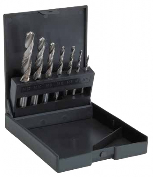 Set kombiniranih ročnih spiralno/navojnih Whitworth svedrov velikosti od BSW 1/8" do BSW 1/2". Vsako orodje je zaradi svoje pregledne postavitve hitro dostopno ob odprtju škatle. Sveder opravlja dve ločeni funkciji v enem orodju; z njim izvrtamo luknjo v material ter naredimo notranji navoj.
