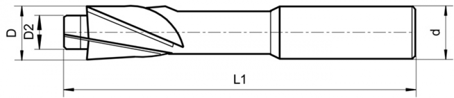 Grezilo s 3 rezili, spiralnimi utori in vodilnim čepom. Za osnovno izvrtino navoja.