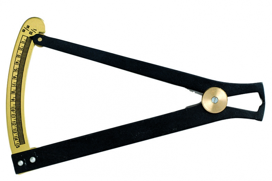 Vzmetno šestilo z medeninasto merilno skalo in bruniranimi nogami. Odčitek 0,1 mm.